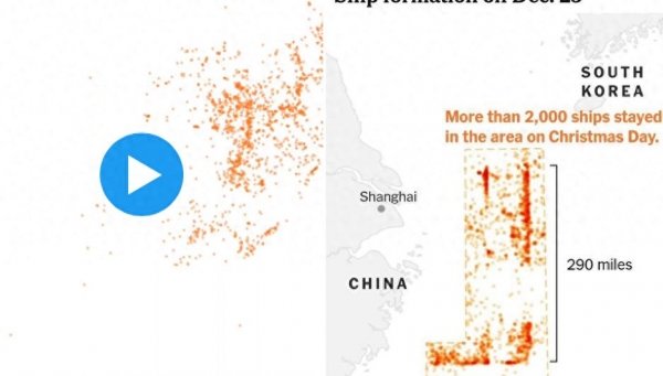 《纽约时报》在独家报道中称:中国渔船最近一起行动是从两周前开始,约1400艘中国渔船突然中止常规捕捞活动,在东海海域大举集结,截至1月11日,从船舶定位资料看,这些船只共同形成长达320公里的队列,海上密度之高直接迫使驶近的货轮绕行、或者改采"之"字形航线穿行。