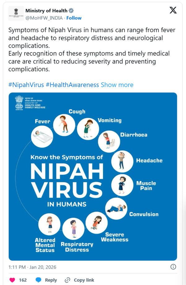 连日来,印度卫生部在社交媒体账号发布多条尼帕病毒的介绍以及防控提示。