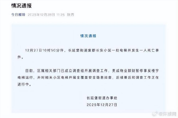 12月28日,西安雁塔通报一小区电梯井发生一人死亡事件:已成立调查组开展调查工作,详情如下: