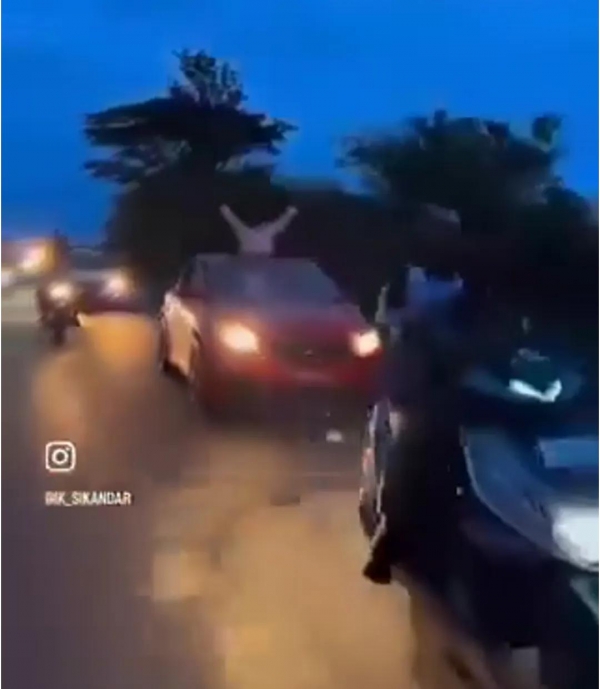 七名嫌疑人乘坐敞开天窗汽车并骑着摩托车和穿过小镇进行庆祝。