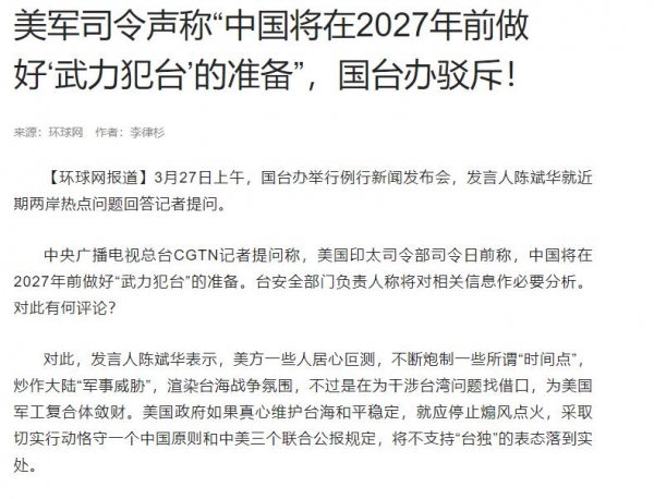 此前美方就已经多次炒作,2027年是中国大陆解放台湾的重要时间节点,对此我国已经多次辟谣。