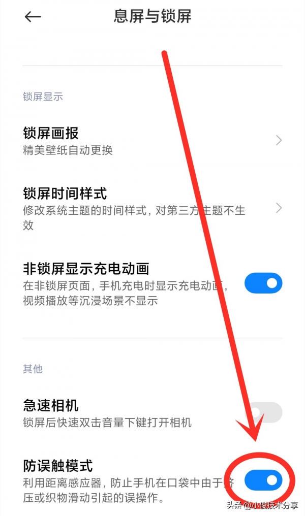 此时我们只需要把防误触开关打开就可以了,打开之后就可以防止手机在口袋中由于挤压或织物滑动引起的误操作了,这样就不会出现自动拨打电话,自动发短信或者自动接听电话的情况了!