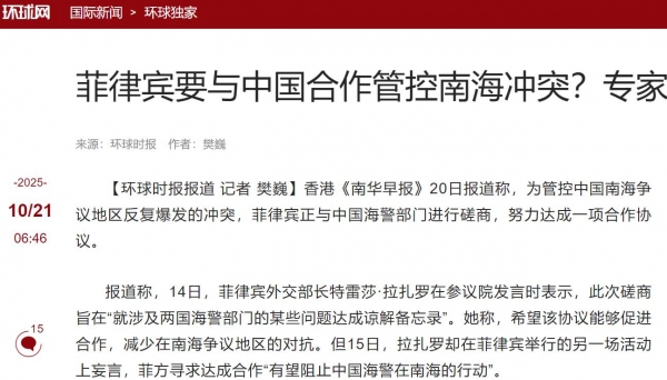 据环球网援引《南华早报》消息报道称,日前菲律宾外长对外表示,为了管控中菲在南海屡屡爆发冲突,菲律宾正在同中国海警部门磋商,尽最大努力达成一项合作协议,以减少双方的军事对抗。
