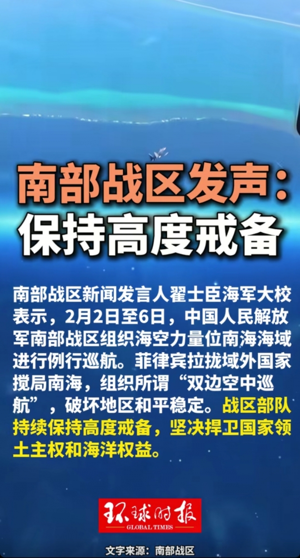 2月2日至6日,中国人民解放军南部战区组织海空力量在南海海域进行例行巡航,菲律宾拉拢域外国家搞所谓"双边空中巡航",战区部队表态要坚决捍卫国家领土主权和海洋权益。