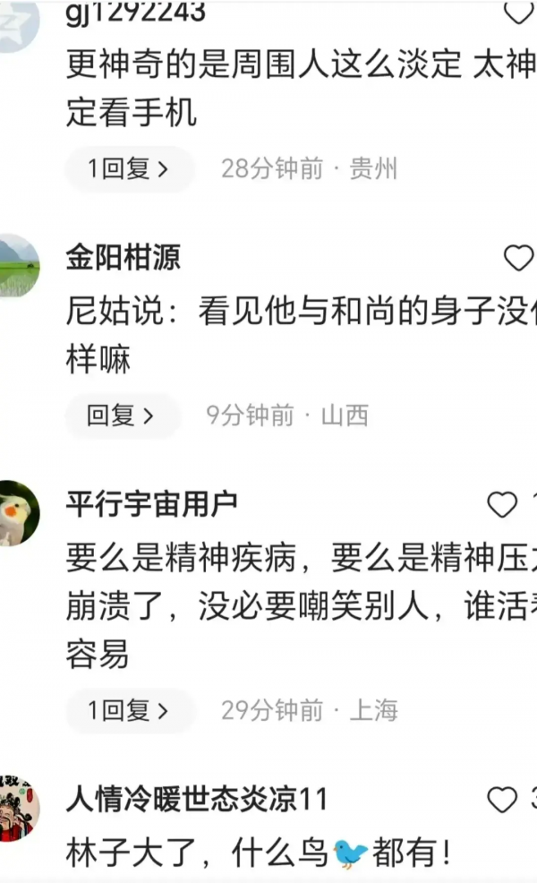 另一位网友则提到了心理健康问题:"也许这名男子有心理问题,我们不应该只是责怪他,而是应该关心他的心理健康。社会应该提供更多的心理健康支持,以帮助那些可能需要帮助的人。"