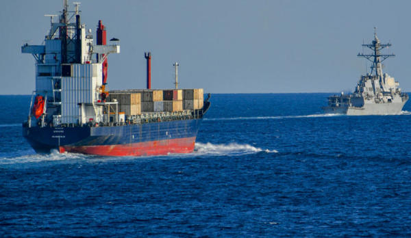 2019年,一艘美国军舰与一艘商船通过霍尔木兹海峡 美国海军