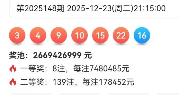 本期的开奖号码是:红色球3、4、9、10、15、22,蓝色球16,本期一等奖有8注,单注奖金748万元,二等奖139注,单注奖金17.8万元!