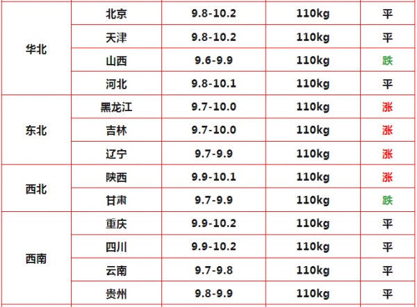 华北地区:河北保持平稳,标猪出栏参考价9.8~10.1元/斤。