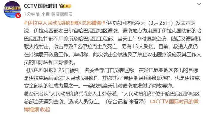 财联社3月26日电,伊拉克国防部25日发表声明说,其位于安巴尔省的下属机构设施--哈巴尼亚基地军事医疗所和工程部当天遭到袭击,7名伊拉克士兵遭袭身亡,另有13人受伤。声明还说,将医疗设施及人员作为袭击对象严重违反国际法及国际公约,伊国防部有权依法采取必要措施回应。与伊朗关系密切的伊拉克民兵武装"人民动员组织"当天也发表声明说,美国和以色列对哈巴尼亚基地发动联合空袭,该地点是"人民动员组织"和伊拉克军方的联合驻地,该组织"遭受物质损失"。