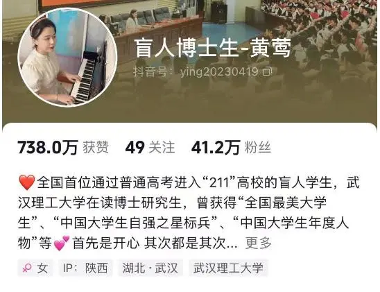 主角之一叫黄莺,打出生起,命运就给她设了道残酷关卡 -- 双目失明。可这姑娘愣是不服输,凭借钢铁般的意志和家人的全力托举,书写了一段传奇求学路。她是全国首位通过普通高考,成功迈入重点大学的盲人学生,本科、保研、再到读博,每一步都踏碎了无数质疑与偏见,在学术的荆棘丛里艰难却坚定地开出了花。