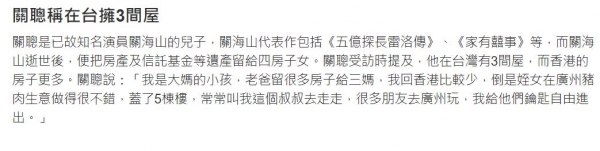 关聪说,家人都分到了钱,他本人在台湾省有三套房子,在香港也有很多套,现在即使他不工作,也没有后顾之忧。