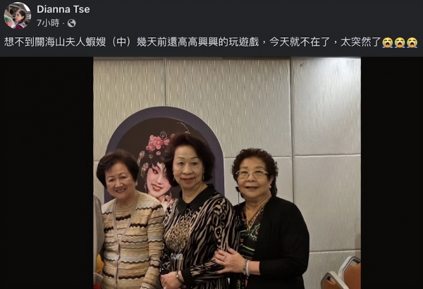 同日,另一位圈内人也突然离世,她是已故资深演员关海山(虾叔)第四任妻子曾娣蓉(虾嫂)。