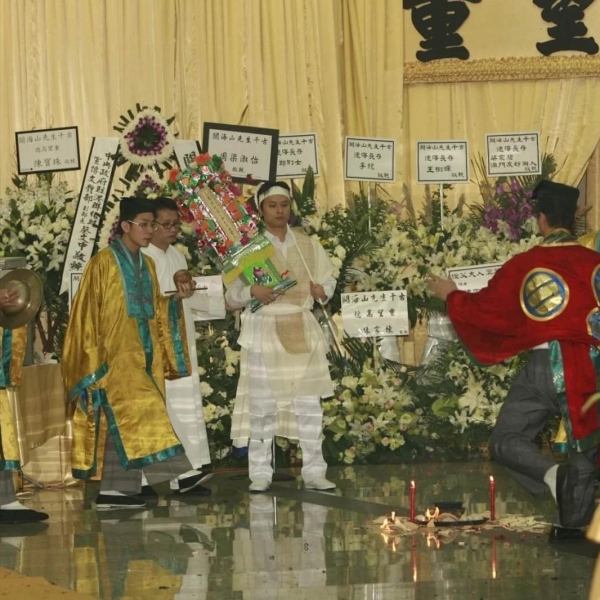 2006年9月14日,关海山去世后三天,遗体被送往殡仪馆的路上,第二任"太太"的长子关楚鸿和第三任"太太"的女儿关至莹,在殡仪馆门口拦下灵车,跪下拜别父亲。