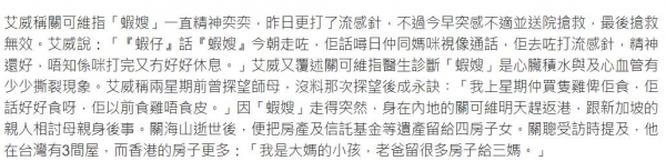 虾嫂在医院过世时,唯一的孩子并不在身边,关可维身处内地,他会在本月29日返港,与新加坡的亲友商讨妈妈身后事。
