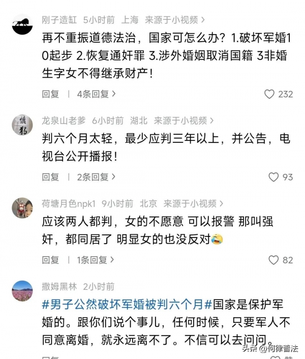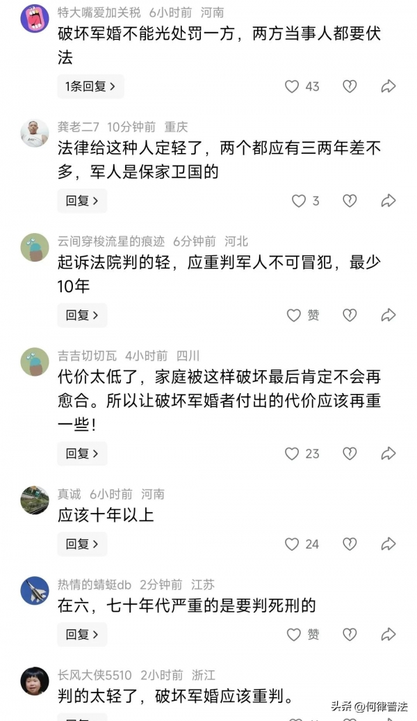 评论区中,不少网友纷纷留言:起诉法院判的轻,应重判军人不可冒犯,最少10年!代价太低了,家庭被这样破坏最后肯定不会再愈合。所以让破坏军婚者付出的代价应该再重一些!