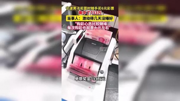 近日,一男子买菜随手买6元彩票,中了733万元大奖引发关注。据媒体1月28日报道,浙江宁波中奖者郑先生领取了1注一等奖,奖金733万元。郑先生说,他的购彩心态比较随缘,每天就是买菜的时候会光顾一下体彩实体店,每次购彩也就是十元左右,郑先生的家人对于他购买彩票也表示支持,"买的也不多,就当作一个爱好也挺好的。"