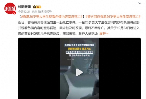 刚看到一则新闻,令人唏嘘。据媒体报道,香港一名26岁的男大学生,在家中房间用布条缠绕颈部,一边观看色情内容,一边寻求某种刺激,结果意外窒息昏迷,没能被及时发现,最终失去了生命。父亲两天后进房查看,才发现儿子已经没了反应。现场电脑还开着,画面定格在某个色情网站。一个本该充满希望的年纪,就这样静悄悄地画上了句号。