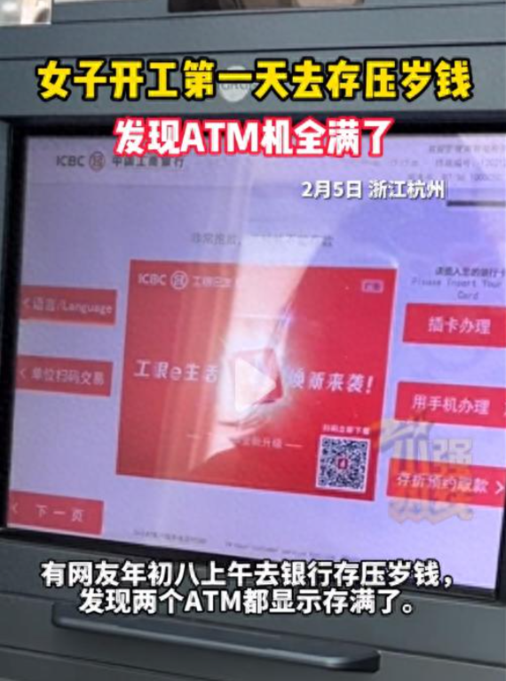女子遭遇存满情况 2025年2月5日,浙江杭州一名女子在年初八的上午前往银行,准备将收到的压岁钱存入银行。然而,她惊讶地发现两个ATM机都显示"存满"。