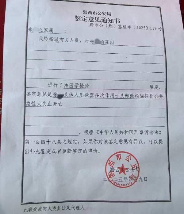 据陈女士提供的警方出具的鉴定意见书显示,张某系他人用砍器多次作用于头部致颅脑损伤合并急性大失血而死。