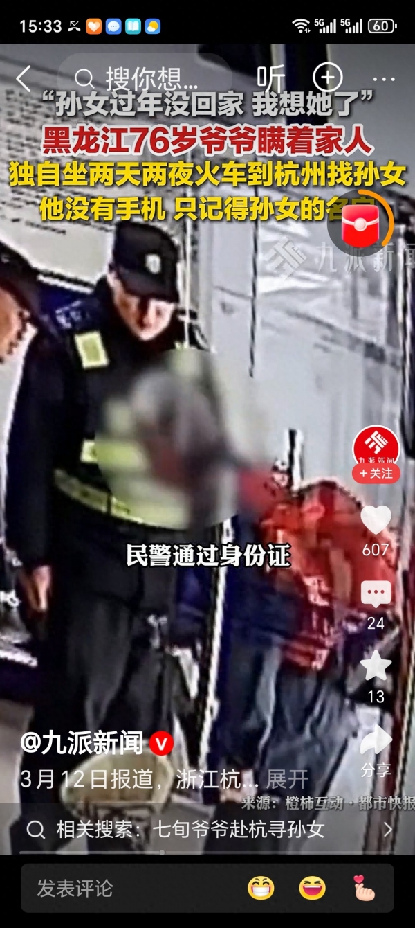 近日,浙江杭州发生一件又好笑又心酸的事。一位76岁的东北大爷,因为太想念过年没回家的孙女,瞒着家人独自出发,坐了两天两夜绿皮火车,跨越2200多公里来看孙女,结果到了杭州才发现--孙女根本不在这,城市跑错了!