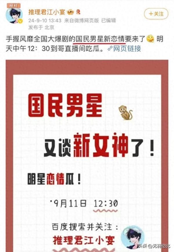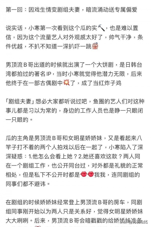 网友们根据这些关键词,开始了各种猜测,这位"国民男星"一定是凭借某部古装剧爆红,并且最近有新作品要上的流量小生;也这次爆料的重点,其实是"剧组夫妻",这位"国民男星"可能只是"躺枪"