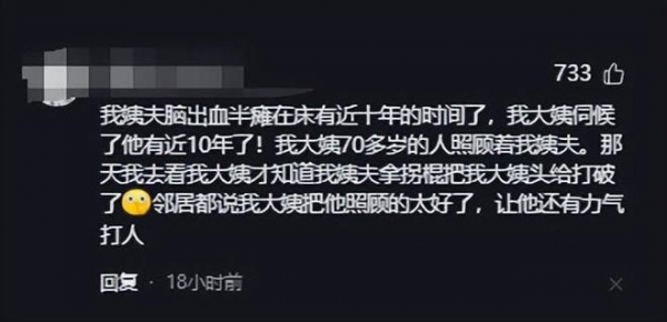 "我姨夫脑出血半瘫在床有近十年的时间了,我大姨伺候了他有近10年了!我大姨70多岁的人照顾着我姨夫。那天我去看我大姨,才知道我姨夫拿拐棍把我大姨头给打破了,邻居都说我大姨把他照顾的太好了,让他还有力气打人"