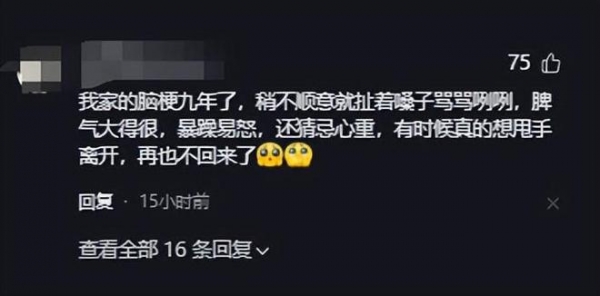"我家的脑梗九年了,稍不顺意就扯着嗓子骂骂咧咧,脾气大得很,暴躁易怒,还猜忌心重,有时候真的想甩手离开,再也不回来了"