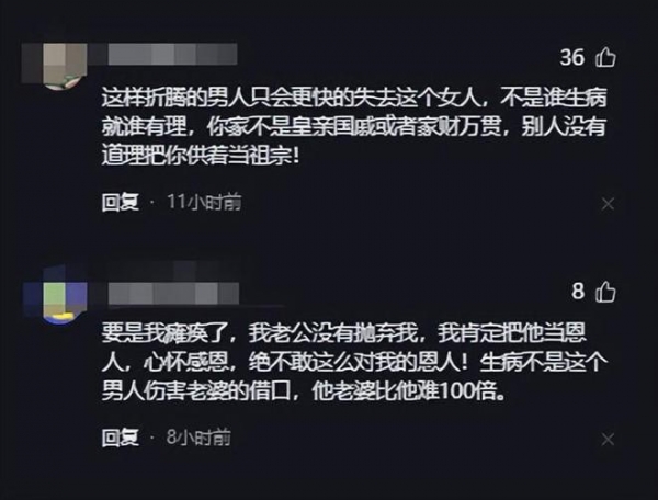 "要是我瘫痪了,我老公没有抛弃我,我肯定把他当恩人,心怀感恩,绝不敢这么对我的恩人!生病不是这个男人伤害老婆的借口,他老婆比他难100倍。"