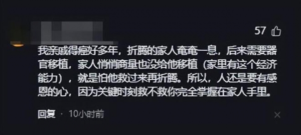 "我亲戚得癌好多年,折腾的家人奄奄一息,后来需要器官移植,家人悄悄商量也没给他移植(家里有这个经济能力),就是怕他救过来再折腾。所以,人还是要有感恩的心,因为关键时刻救不救你完全掌握在家人手里。"