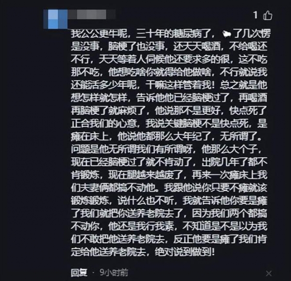 "我公公更牛呢,三十年的糖尿病了,羊了几次愣是没事,脑梗了也没事,还天天喝酒,不给喝还不行,天天等着人伺候他还要求多的很,这不吃那不吃,他想吃啥你就得给他做啥,不行就说我还能活多少年呢,干嘛这样管着我!