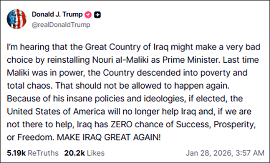 此前25日,伊拉克议会多数派什叶派联盟"协调框架"发表声明,以内部多数票推举伊拉克前总理马利基为新任总理候选人。28日,得知此事的美国总统特朗普随即在"真实社交"上公开警告伊拉克,称若执意让马利基上台,美国将"不再提供任何帮助",并斥责马利基的政策与意识形态极其"疯狂"。