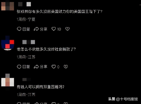 有些嘴毒的网友直接在评论区,就张铁林的英国国籍说事。