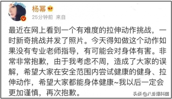 后来被专家指出,这样的动作非常危险,能不做就不要做,杨幂才出来发文道歉。