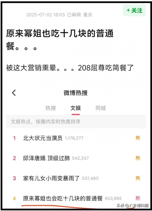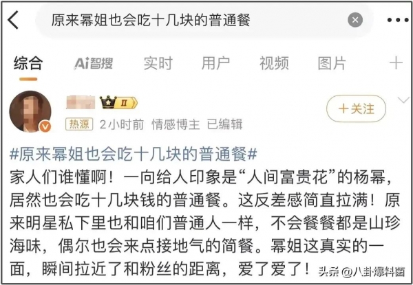 这边"雌竞风波"刚过,又买了"原来幂姐也会吃十几块的普通餐"的热搜,没完没了了是吧!