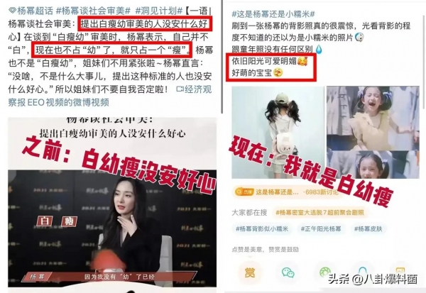 曾经很长的一段时间,"白幼瘦"这样的词在网络上非常流行,杨幂还曾反对过白幼瘦的审美,还称提出这种标准的人没安什么好心。