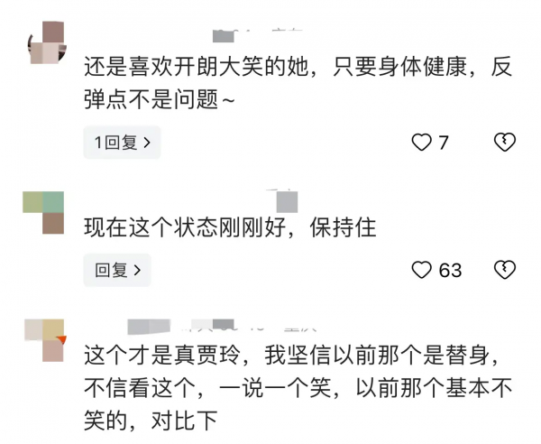 年初的时候贾玲说自己是110斤,现在看上去应该在130斤左右。随着体重的回升,贾玲的人气也跟着回来了,评论区一片夸赞。