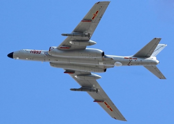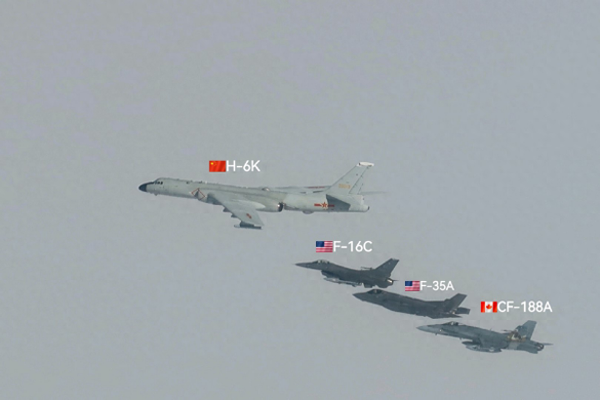 (美加战斗机编队靠近轰-6,仿佛在为中国空军"护航")
