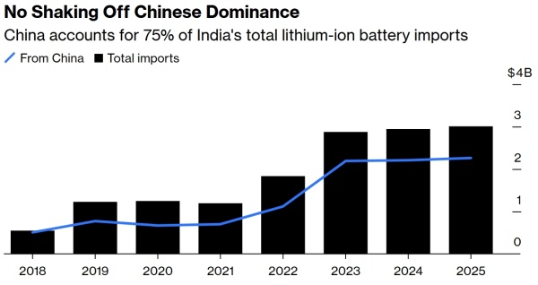 与本土产能的惨淡形成鲜明对比的是,印度电动汽车制造商及其他相关企业的锂离子电池进口额已增至原来的2.5倍,达到30亿美元,其中75%的进口量都来自中国。