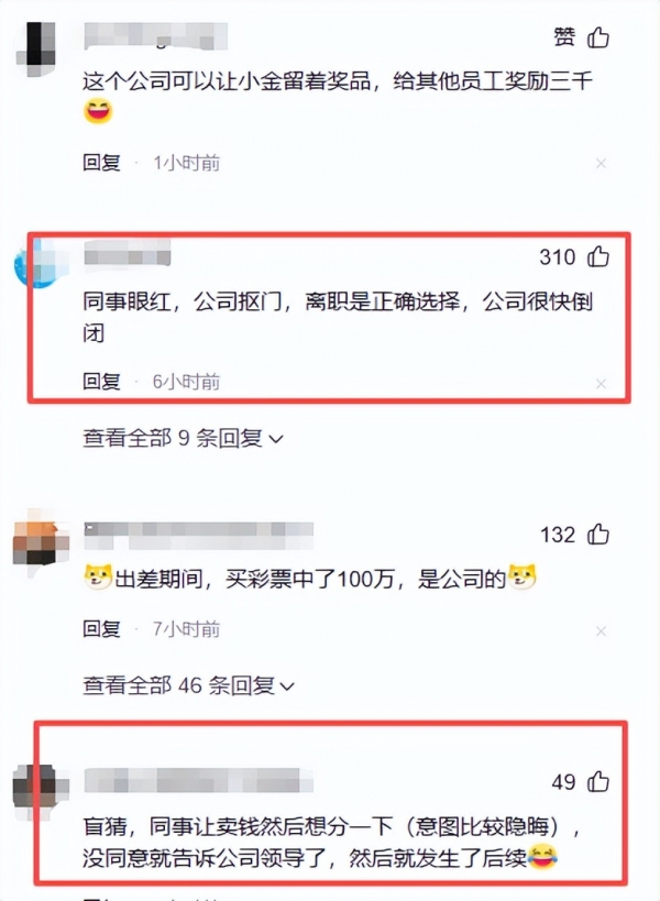 大多数网友还是站在小金一边,"这是靠运气抽到的,不是靠公司资源赚来的。""如果抽中的是罚款,公司是不是也认领?"