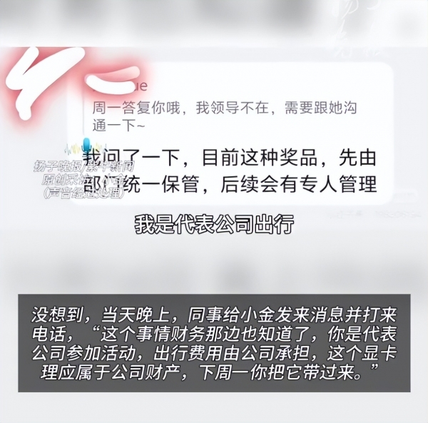 他说:"这个显卡你得上交,公司财务已经知道了,你是代表公司来的。"随后还发来文字补充:"下周一记得带到公司。"
