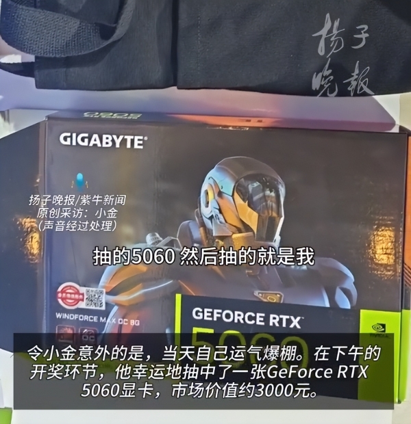 在下午6点左右的开奖环节,主持人直接念出了他的名字,他幸运地抽中了一张GeForce RTX 5060显卡,市场价值约3000元。