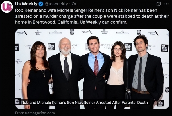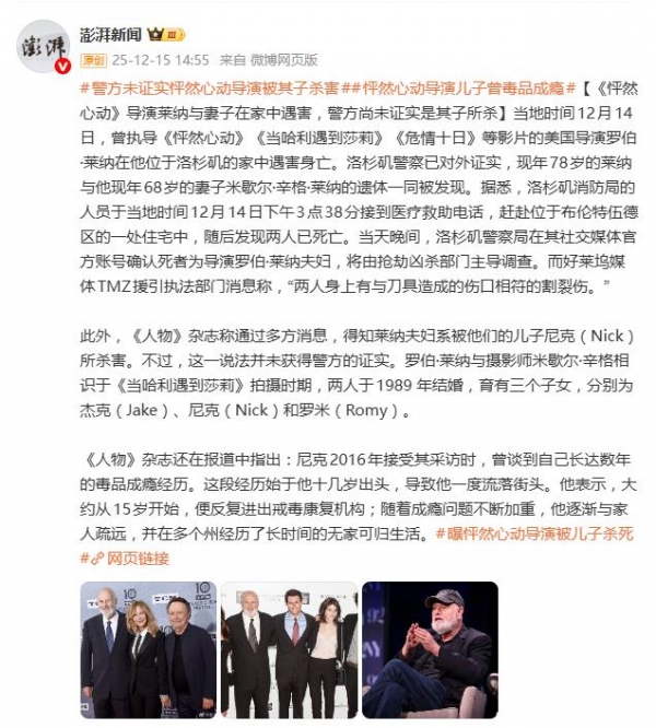 曾执导《怦然心动》《公主新娘》等经典影片的好莱坞导演罗伯·莱纳,与其妻子米歇尔·辛格的离世方式,震惊了全球影迷--不是自然衰老,不是意外,而是疑似在自家豪宅中遭遇了致命暴力。更令人脊背发凉的是,指向的嫌疑人竟是他们的亲生儿子。
