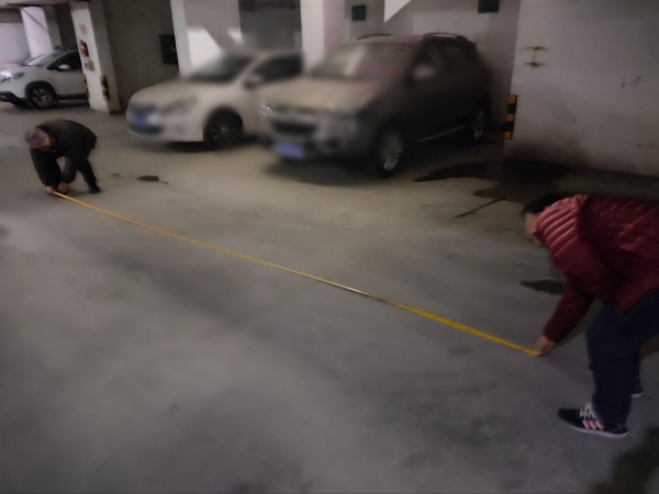 干先生和妻子拿卷尺示意车辆痕迹长度
