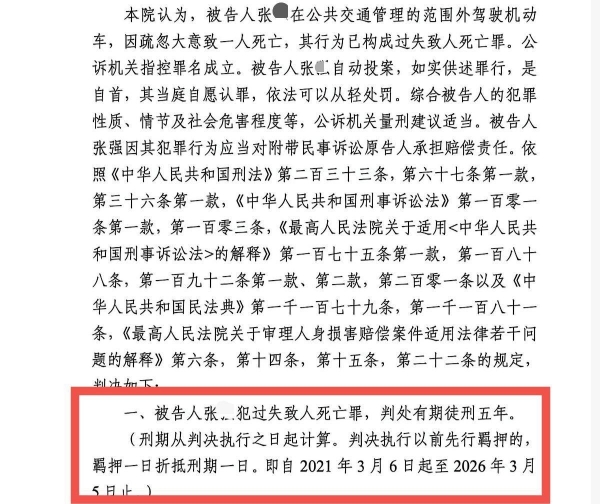 2025年12月9日,一审判决结果出炉。法院认定,张某在小区车库(非公共道路)驾车,因"疏忽大意"致妻子死亡,构成过失致人死亡罪。鉴于他有自首和认罪情节,最终判处有期徒刑五年。