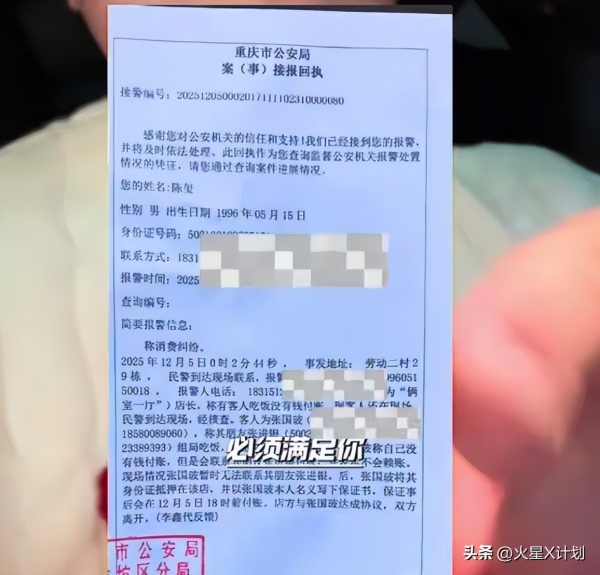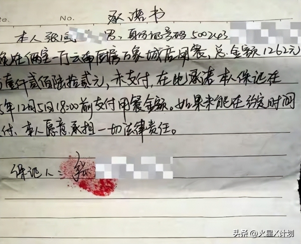 在民警协调下,张先生当场写下一份书面承诺书,保证在12月5日下午前支付全部1262元餐费,并押下了自己的身份证,承诺书上明确写着:"如果未能在约定时间支付,本人愿意承担一切法律责任。"