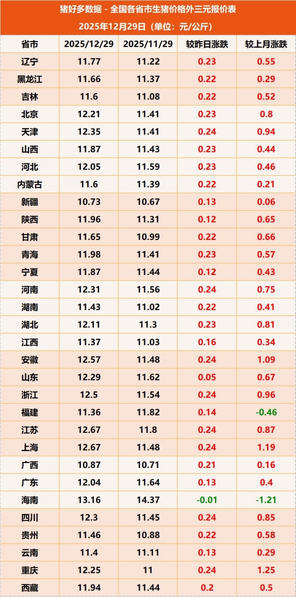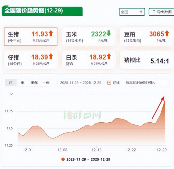 据猪好多数据监测显示,12月29日全国外三元生猪均价为11.93元/公斤,较昨日上涨0.23元/公斤,叠加前一日0.13元/公斤的涨幅,生猪行情2日大涨0.36元/公斤。
