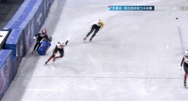 然而美国队的突然摔倒带倒了韩国队,这使得韩国队最终以第三名完赛,由于是在第三位滑行时摔倒的,按照规则无法获得因对手犯规导致的"冤枉情况"而判晋级。