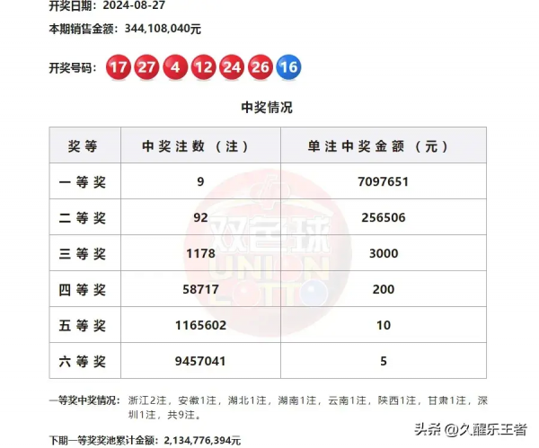 本期开出一等奖9注,奖金709万。二等奖 92注,奖金25.65万。