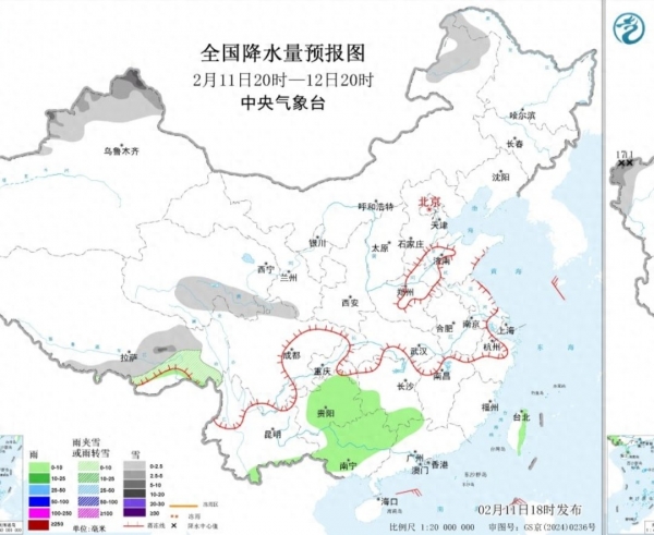 2月11日20时至12日20时,新疆北部、内蒙古东北部、西藏东部、青海南部等地部分地区有小到中雪或雨夹雪,其中,新疆北疆北部、西藏东部等地部分地区有大雪,局地暴雪(10~12毫米)。湖南南部、贵州大部、广西大部、台湾岛东部等地部分地区有小雨(见图1)。台湾海峡、台湾以东洋面、南海东部和西南部海域将有4~6级、阵风7级的偏北到东北风,巴士海峡将有5~6级、阵风7级的偏东风。