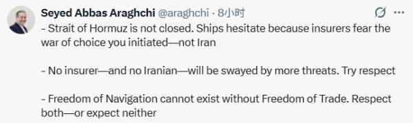 伊朗外长阿拉格齐当天在社交平台表示,没有贸易自由,就没有航行自由。"要么同时给予二者尊重,要么都别期待。"